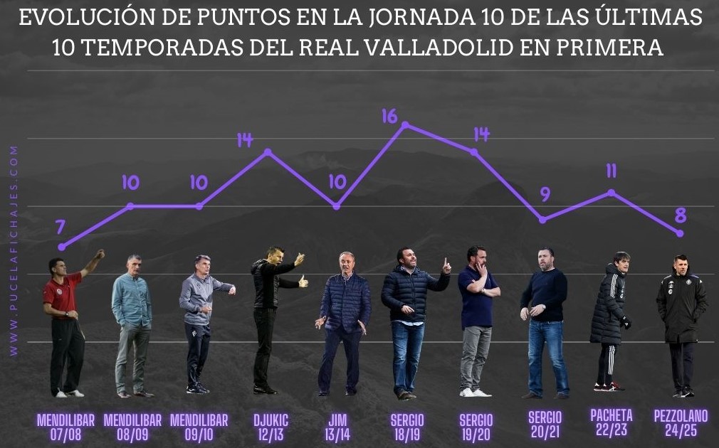 Transcurridas las primeras 10 jornadas de Liga y el Real Valladolid situado en el puesto decimoctavo en puestos de descenso con 8 puntos, se pueden sacar las siguientes conclusiones comparando la temporada actual con las últimas 10 en Primera División: