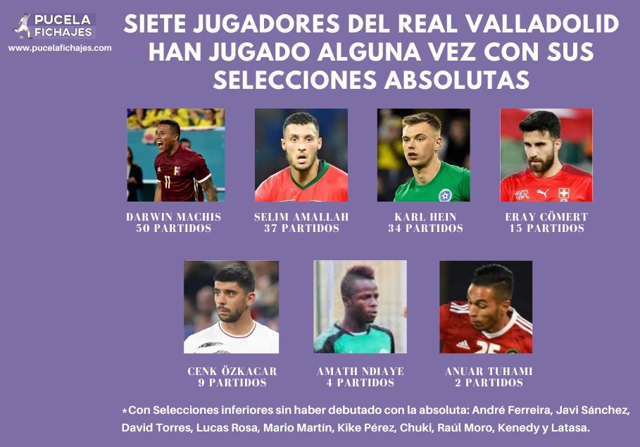 El Real Valladolid cuenta en su plantilla con 7 jugadores que han participado en algún momento con sus Selecciones absolutas, siendo Darwin Machís el que más ha participado con un total de 50 partidos. Actualmente solo 3 están participando en las últimas convocatorias (Hein, Cömert y Machis), mientras que el resto han dejado de aparecer en las mismas.