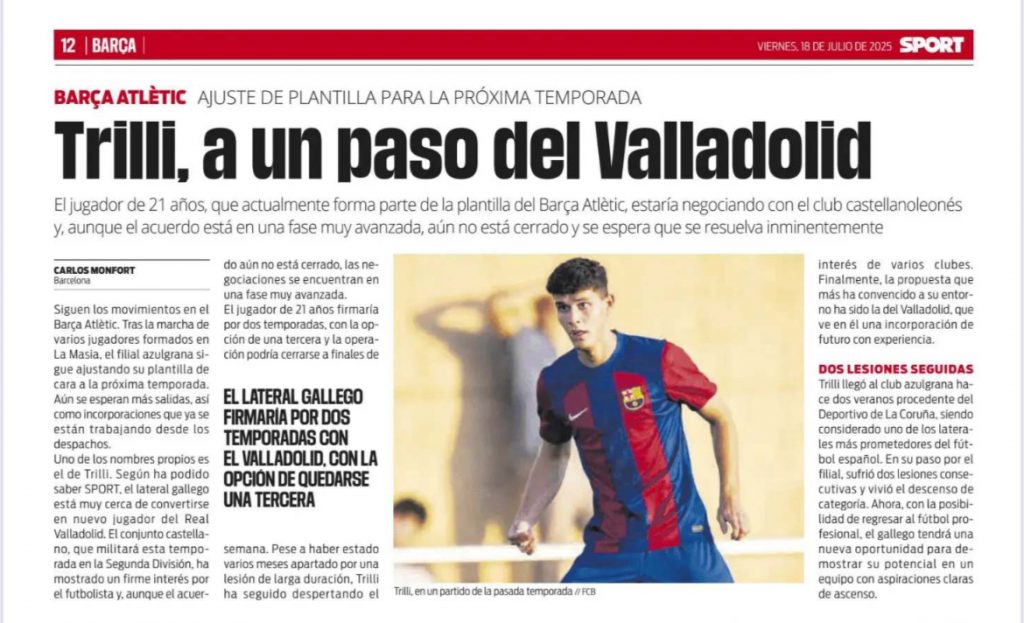 Hoy se hará oficial el fichaje de Trilli por el Real Valladolid, de hecho esta mañana se ha entrenado con sus nuevos compañeros. Desde la prensa catalana, el diario SPORT en su edición impresa informa del fichaje del lateral derecho por el conjunto blanquivioleta.