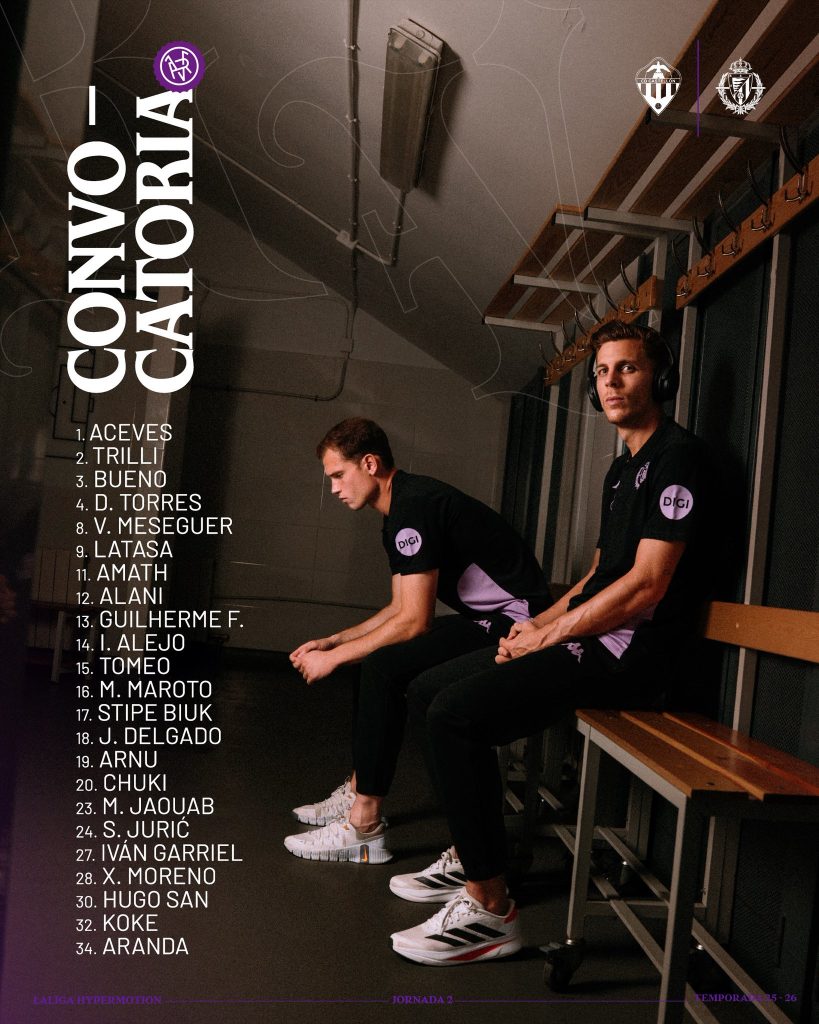 El Real Valladolid se enfrenta mañana viernes a las 21.30 con el Castellón en el SkyFi Castalia, y esta es la convocatoria facilitada por Guillermo Almada: Aceves, Guilherme Fernandes, Trilli, Koke Iglesias, Guille Bueno, Iván Garriel, Hugo San, David Torres, Pablo Tomeo, Mohamed Jaouab, Aranda, Víctor Meseguer, Stanko Jurić, Alani, Mario Maroto, Chuki, Ivan Alejo, Xavi Moreno, Amath Ndiaye, Stipe Biuk, Jorge Delgado, Arnu y Juanmi Latasa.