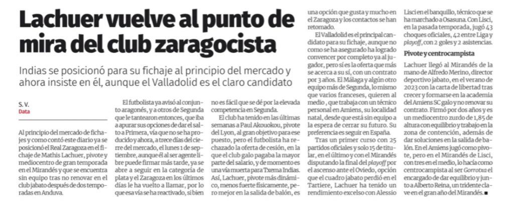No obstante, la competencia es amplia. Zaragoza, Málaga y otros conjuntos de la categoría, además de varios clubes de Francia, también han mostrado interés en el mediocentro. Lachuer, que se ejercita en su localidad natal de Amiens con un preparador personal, mantiene como prioridad seguir en España.