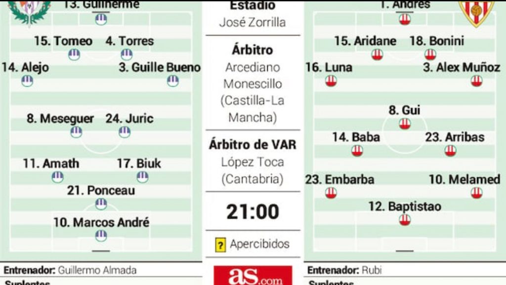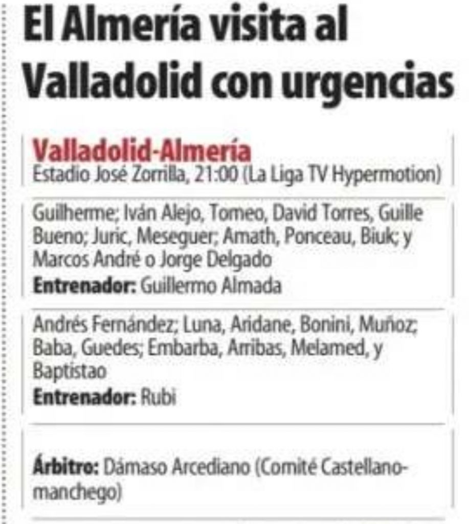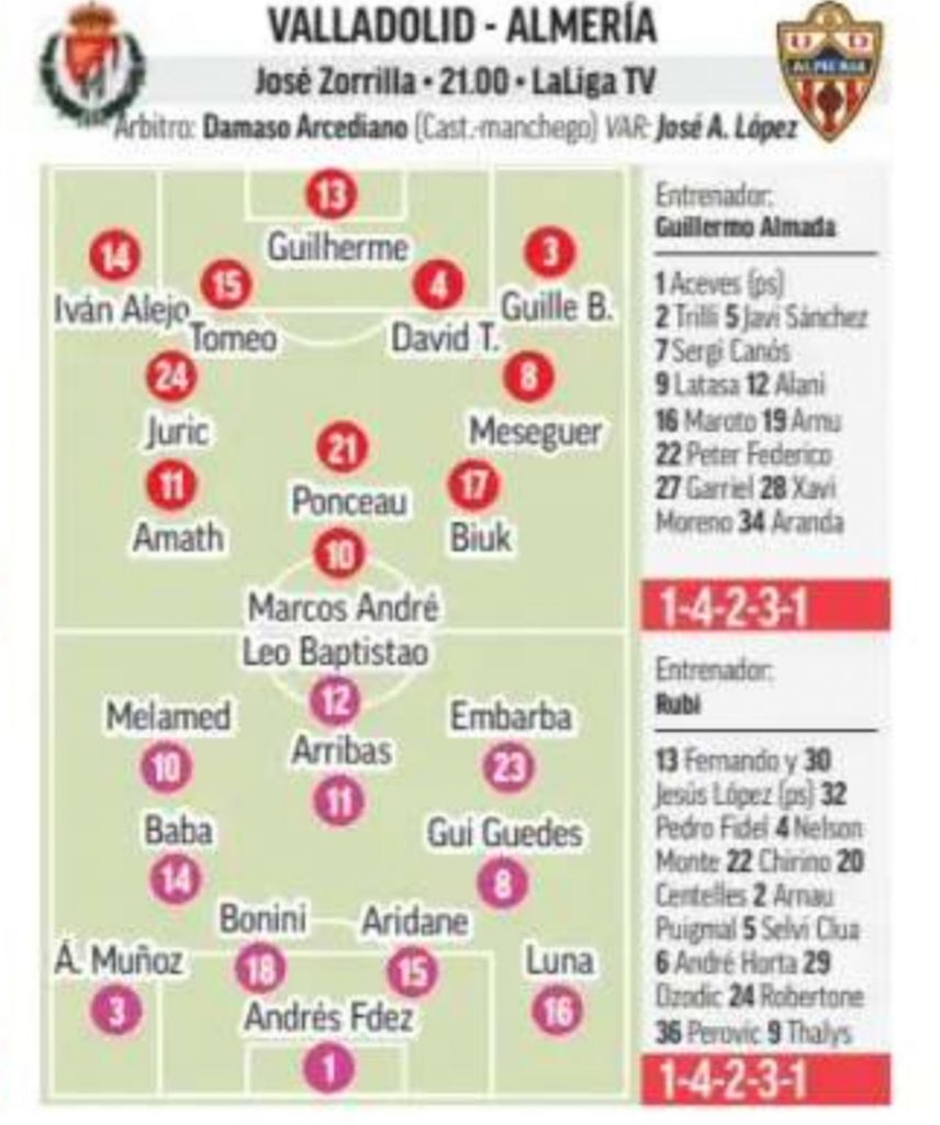 Hoy el Real Valladolid se enfrenta en el Estadio José Zorrilla frente al Almería a las 21:00 horas y hoy será el día que Guillermo Almada no repita el “11” inicial tras 4 jornadas. Chuki lesionado no podrá jugar y Latasa con molestias es duda.