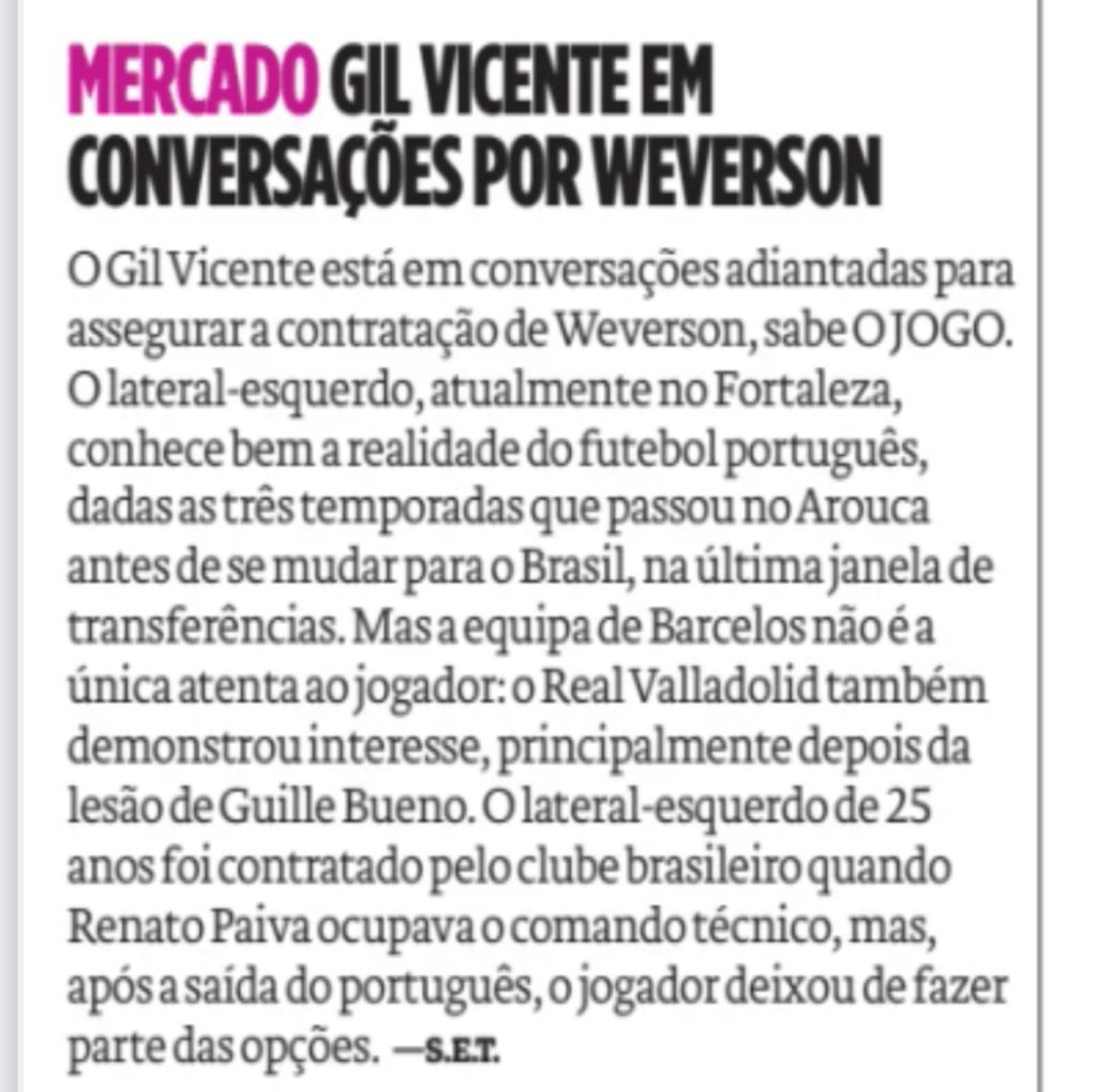 El Real Valladolid se ha sumado a la lista de clubes interesados en Weverson, lateral izquierdo brasileño actualmente en las filas del Fortaleza, según informa el diario portugués O JOGO en su edición impresa. El Gil Vicente mantiene conversaciones avanzadas para hacerse con los servicios del jugador, aunque no es el único equipo atento a su situación.